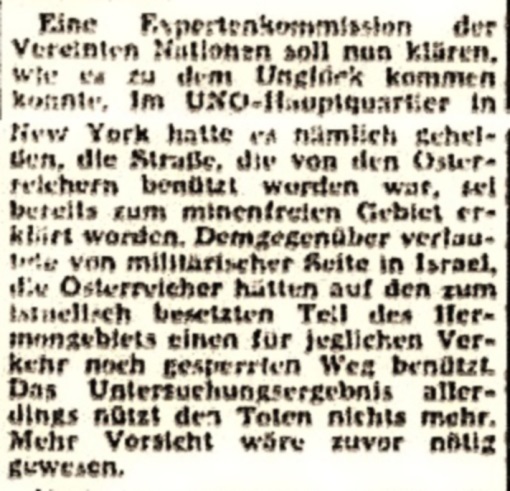Vorerst war es allen Anwesenden ein Rätsel, wie es zu diesem Unfall kommen konnte. Ich ließ es dabei bewenden und begab mich wieder auf den Rückweg an die Unfallstelle. Die Pioniere waren bereits dabei, die Straßensperren mit einem Bulldozer zu beseitigen die Sanitäter machten sich wieder auf den Rückweg, denn Zgf Hofer war inzwischen seinen Verletzungen erlegen. Ich kam gerade noch dazu, als er mit den anderen Toten abtransportiert wurde. Hier wurde mir erst bewusst, dass von der Explosion der Mine bis zu meiner Rückkehr, höchstens 2 Stunden vergangen waren, dass die Rettungstrupps der Israelis innerhalb von 30 Minuten vor Ort waren, dass die eigenen San-Trupps aus Quanaquer ebenfalls in Rekordzeit an der Unfallstelle eintrafen, und dass das Menschenmögliche getan wurde, auch wenn es vergeblich war. Am Nachmittag kommt dann der Befehl, die Besetzung des Hermon über die israelische Seite zu vollziehen. Um 2100 Uhr L erstatte Lagemeldung an Bkdo: