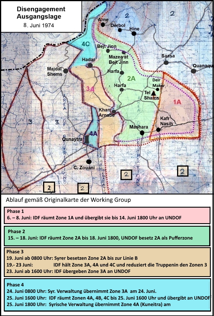 Das bedeutet, dass das Disengagement spätestens am 7. Juni beginnen und innerhalb der folgenden 20 Tage enden musste. Damit war auch klar, dass die ersten 2 Phasen des Disengagements von der 1. Kompanie allein zu bewältigen waren, bis die 2. und 3. Kompanie nachgezogen waren. Montag 3. Juni 1974 |