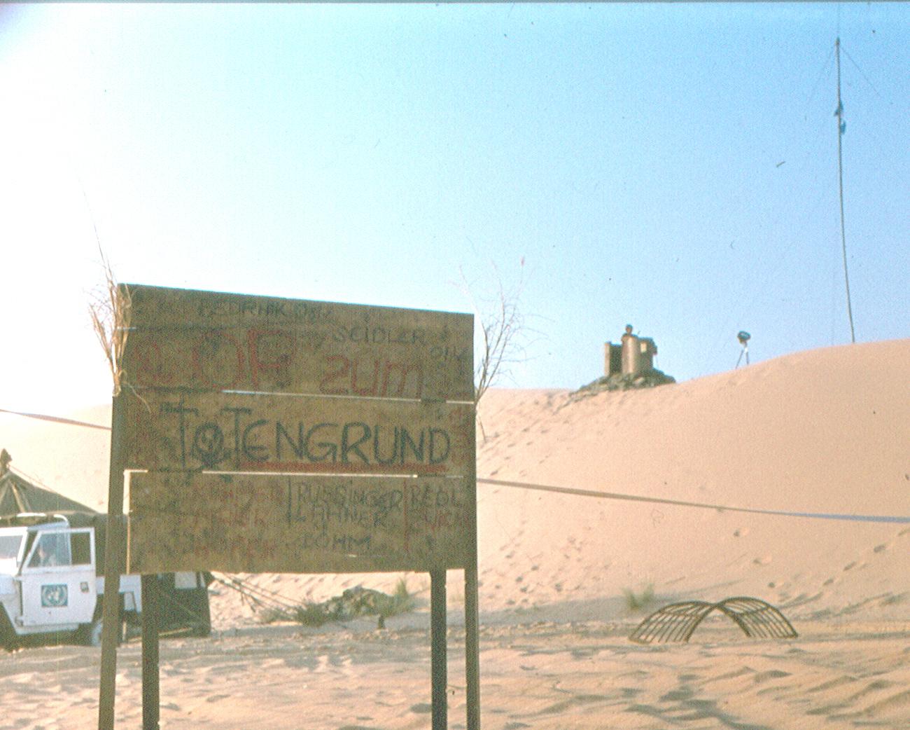 Samstag 23. 3. 1974 Um 0700 Uhr soll die Übergabe stattfinden. Kommandiert wird französisch und deutsch. Dann zieher die Afrikaner ab und ich bin Herr über 100 Quadratkilometer Wüste. Die Positions müssen komlett umgebaut werden, da die Senegalesen die Zelte in Mulden gebaut hatten, die kein Bisschen Wind den Weg fand. Außerdem hatten sich dichte Fliegenschwärme niedergelassen. Die Position 118 wird fast zur Gänze neu errichtet |