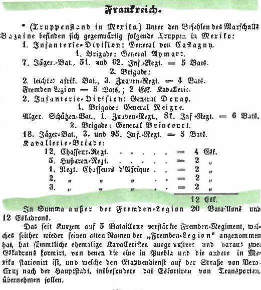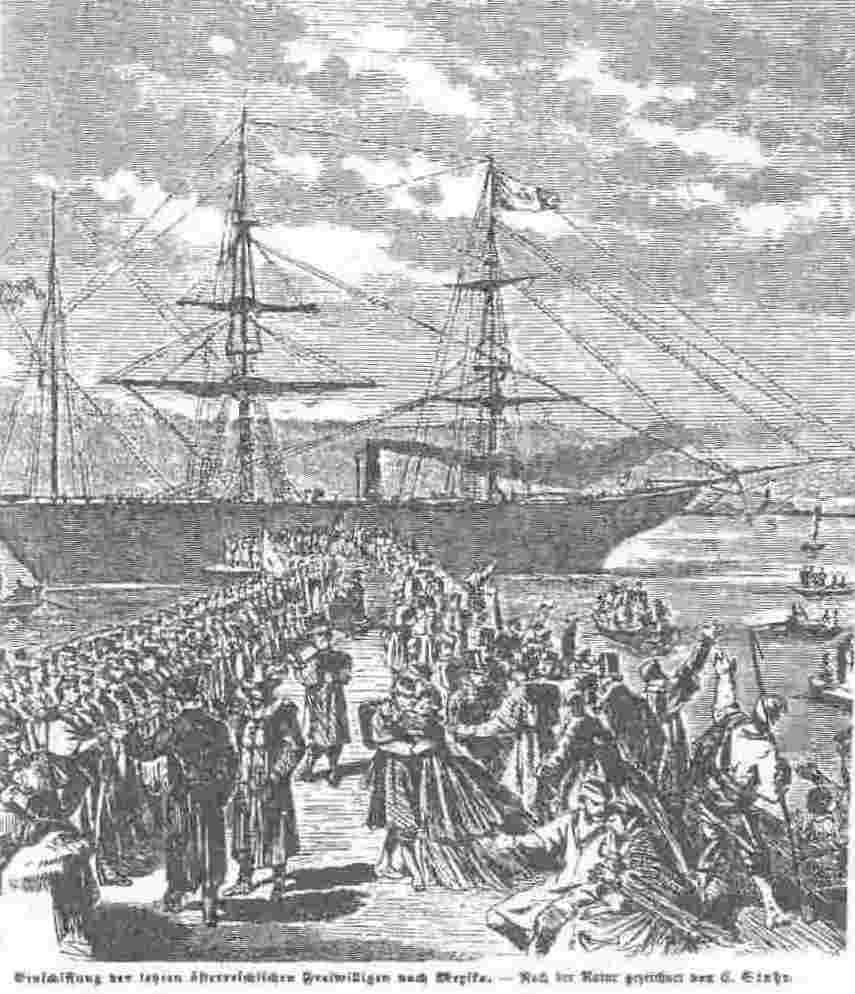 III. Das Österreichisch-belgische FreiwilligenkorpsAls Gegenleistung für den Verzicht auf die Agnatenrechte, hatte Kaiser Franz Josef die Anwerbung und Aufstellung eines Freiwilligenkorps in der Stärke von etwa 6000 Mann genehmigt. Damit folgte er dem Beispiel Maximilians Schwiegervater, König Leopold von Belgien, der schon zuvor an die 1500 Belgier anwerben ließ. Diese beiden Freiwilligenverbände sollten Maximilian nach Mexiko folgen, um ihn bei der Etablierung seiner neuen Herrschaft zu unterstützen.