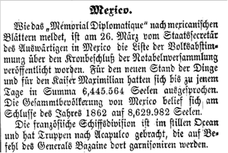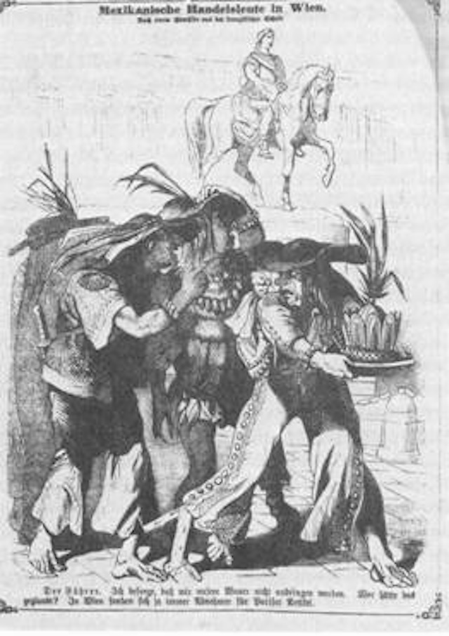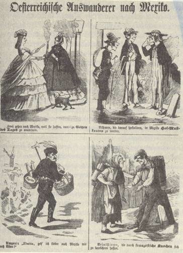 Das Echo in den Medien Angesichts des Krieges in Dänemark, hielt sich das öffentliche Interesse in Grenzen. Zwar berichtete die Wiener Abendpost unter dem Titel die mexikanische Angelegenheit in regelmäßiger Folge von den militärischen Erfolgen der französischen Interventionstruppen gegen Benito Juarez´ republikanische Armee, doch mit dem Eintreffen einer offiziellen Delegation der mexikanischen Notabelnversammlung im Oktober 1863, die Erzherzog Ferdinand Max zur Annahme der Kaiserwürde bewegen sollte, wurde das "Mexikanische Abenteuer" zum Diskussionsstoff der breite Massen der Bevölkerung. Besonders der Boulevard sparte nicht mit mehr oder weniger geschmacklosen Beiträgen. |