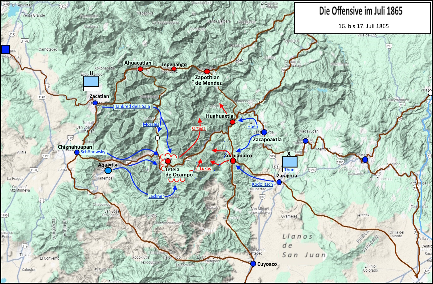 5. Die JulioffensiveAm 13. Juli kündigte Lucas den Waffenstillstand auf und erklärte, die Feindseligkeiten am 16. Juli aufnehmen zu wollen. Damit waren die Würfel gefallen, und die von langer Hand vorbereitete Offensive eröffnet. Sie begann mit einem von zwei Seiten geführten Angriff auf die Cumbres de Apulco, wo sich Lucas' Coutecommacjos zurückgezogen hatten und auf Tetela de Ocampo, wo sich Ortega und Mendes verschanzt hatten. Thuns Operationsplan bezweckte vorrangig die Zerschlagung der Cuatecomacos, bzw. ihnen den Rückzug in die Tierra Caliente zu verwehren. Die Voraussetzungen hiezu sollten mit der Einnahme von Tetela de Ocampo von Westen her, sowie der Einnahme der Angriffsziele Zautla, Huahuaxtla geschaffen werden. Mit der nachhaltigen Besetzung dieser Positionen sollte ein Ring um das Gebiet der Cuatecomacos gebildet und danach weitere Vorstöße in das Zentrum geführt werden..