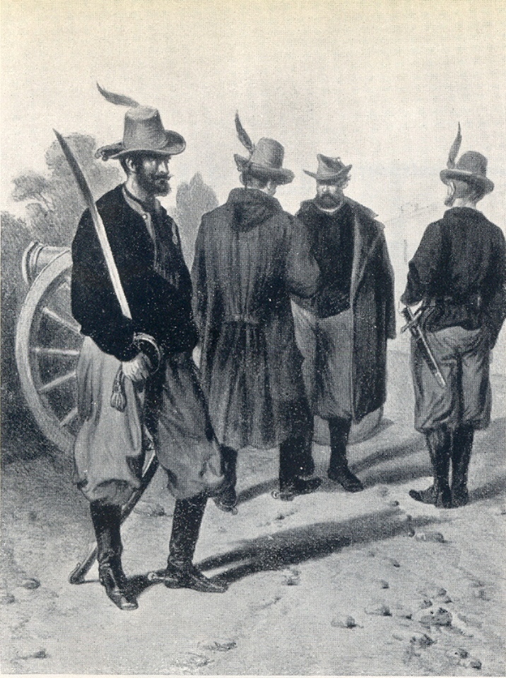 (9) Am 11. April 1865 wurde eine nach Tacombaro beorderte Einheit von 200 Mann von republikaischen Truppen angegriffen und zur Kapitulation gezwungen, nachdem etwa ein Dutzend gefallen waren. Die etwa 200 Gefangenen wurden nach mehreren Wochen ausgetauscht. - (zurück zum Text)