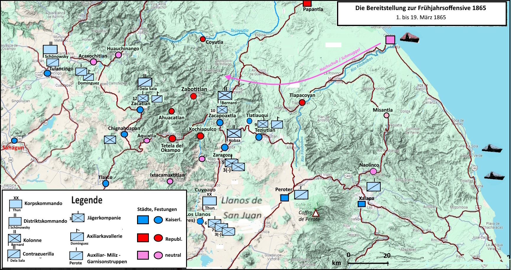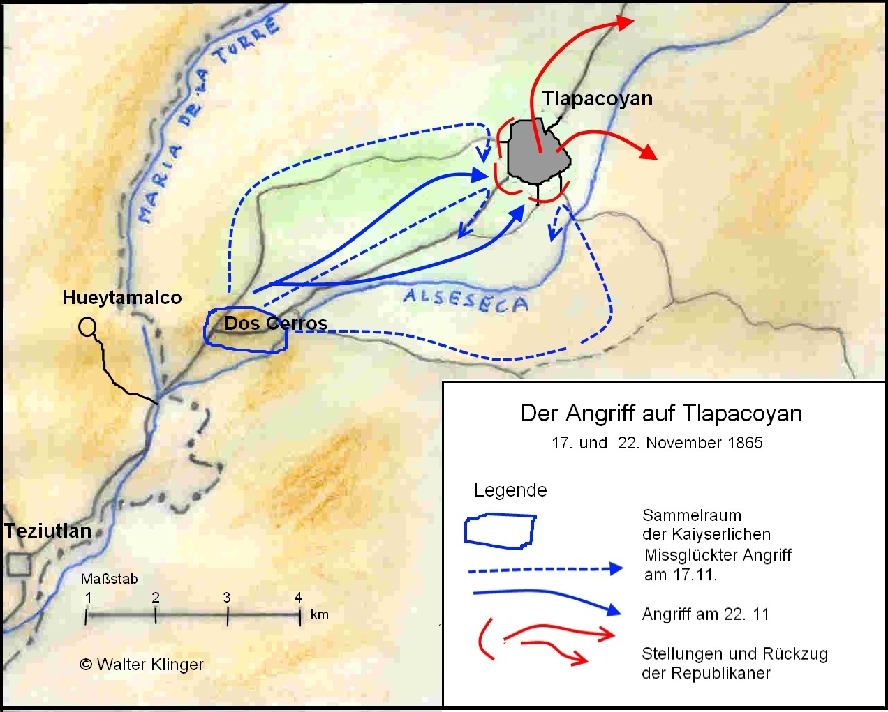 Die Lage im August 1865Nach den letzten Kämpfen kam man im Hauptquartier von Zacapoaxtla zur Einsicht, daß die Angriffe gegen Xachiapulco wenig fruchtbringend seien, da der Feind nirgends nachhaltig zu fassen war und , stets Schlupfwinkeln fand, wo er nicht aufzufinden war und eine dauerhafte Besetzung nicht möglich war. Andererseits hatten sich im Laufe der Monate August und September bedeutende republikanische Kräfte im Bereich um Tlapacoyan gesammelt, die eine latente Bedrohung für Tesuitlan und die Region um Xalapa wurden.