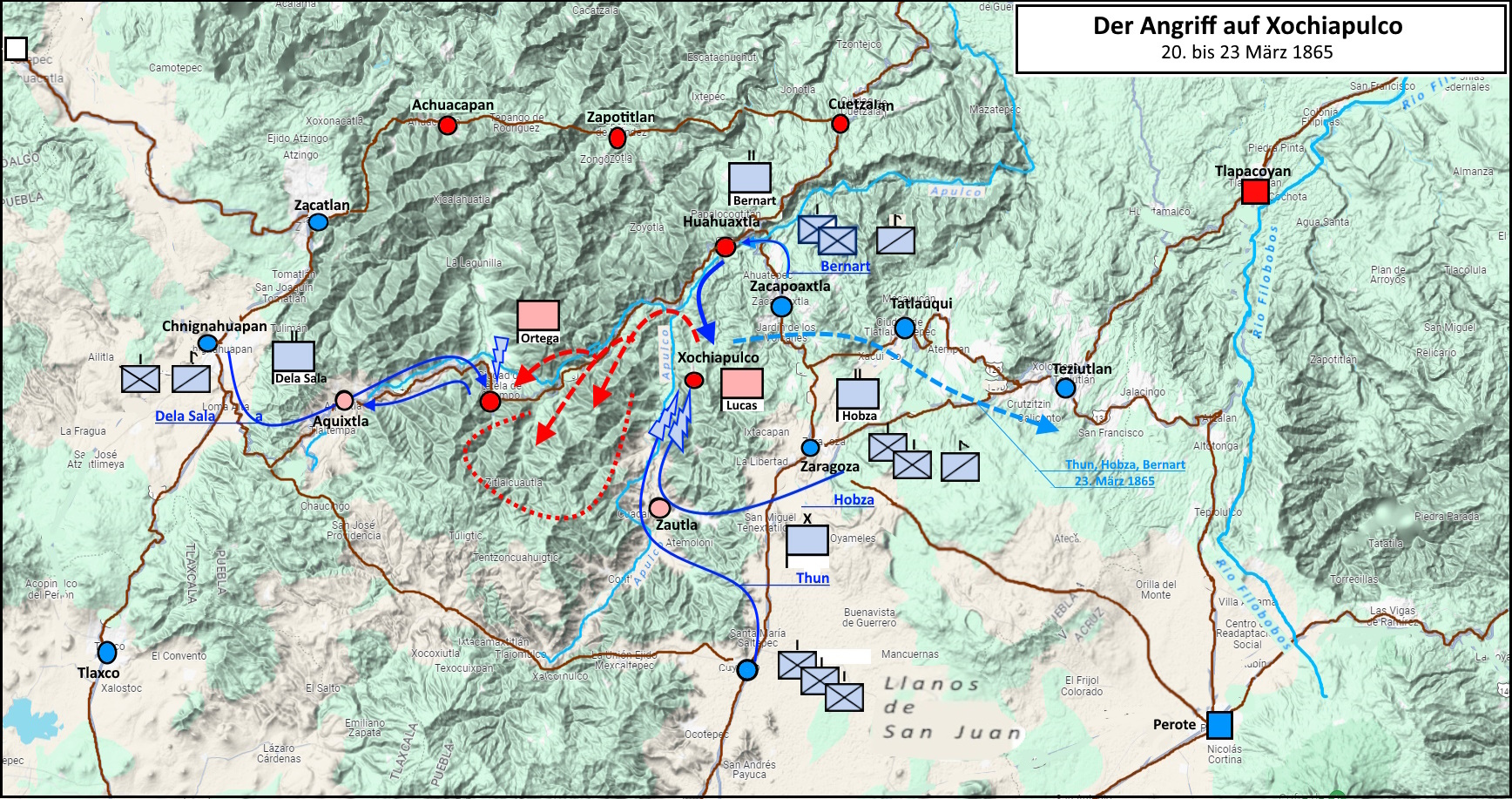 Der Angriff auf Xuchiapulco begann in den frühen Morgenstunden konzentrisch von 3 Seiten. Als die Österreicher in den Ortskern eindrangen, fanden sie diesen verlassen - die Cuatecommachos hatten sich in die umiegenden Barrancos zurückgezogen. Der Angriff der Kolonne Dela Salla blieb zwar vor Tetela del Campo wegen fehlender Unterstützung liegen, doch Salla konnte die umliegenden Ortschaften für das Kaiserreich gewinnen. |
