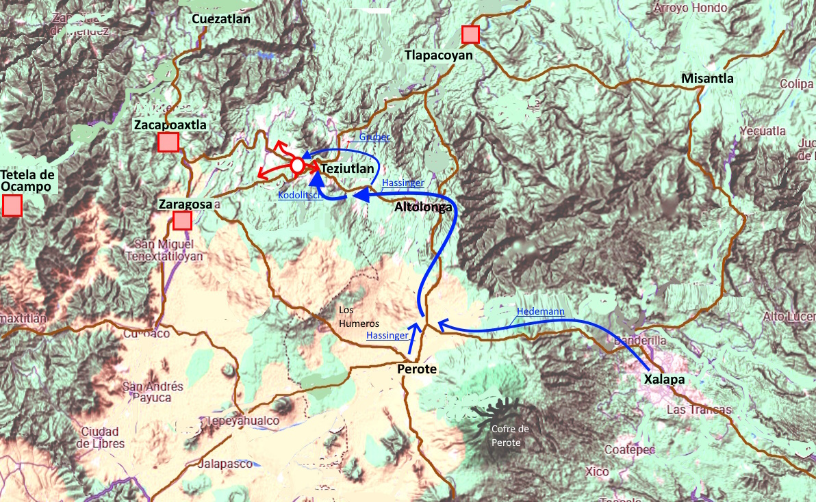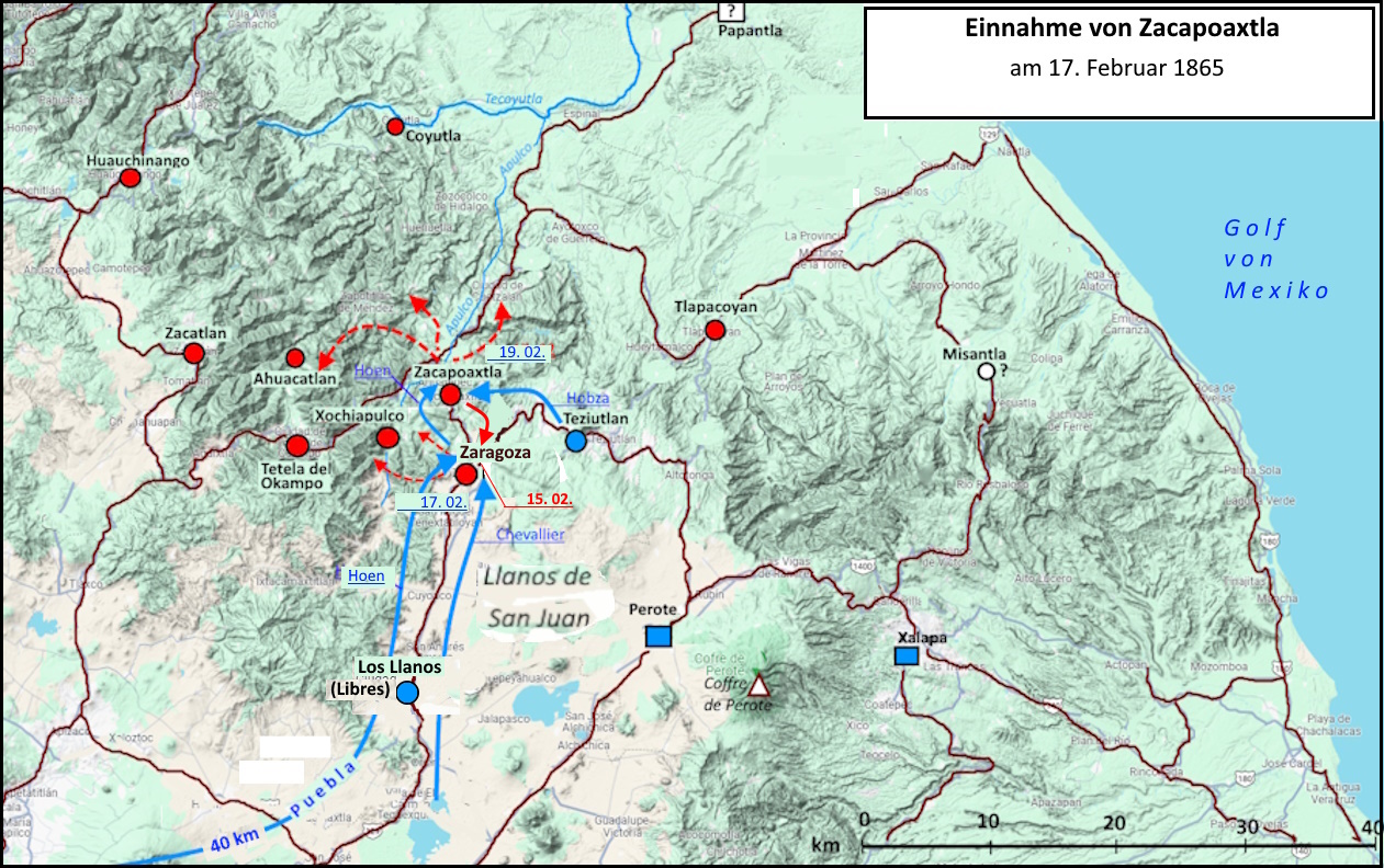 Am 17. Februar setzten sich von Zaragoza aus antretend, 2 Kolonnen in Marsch: Die 10. Jägerkompanien von Hptm Hoen und Capitain Chevallier mit einer Kompanie Fremdenlegion, 80 mexikanischen Reitern und 60 Auxiliares, während Hobza mit 200 Mann von Teziutlan auf Zacapoaxtla vormarschierte und am 19. Februar als erster vor Ort war, um festzustellen, dass sich der Feind aus dem Staub gemacht hatte. |