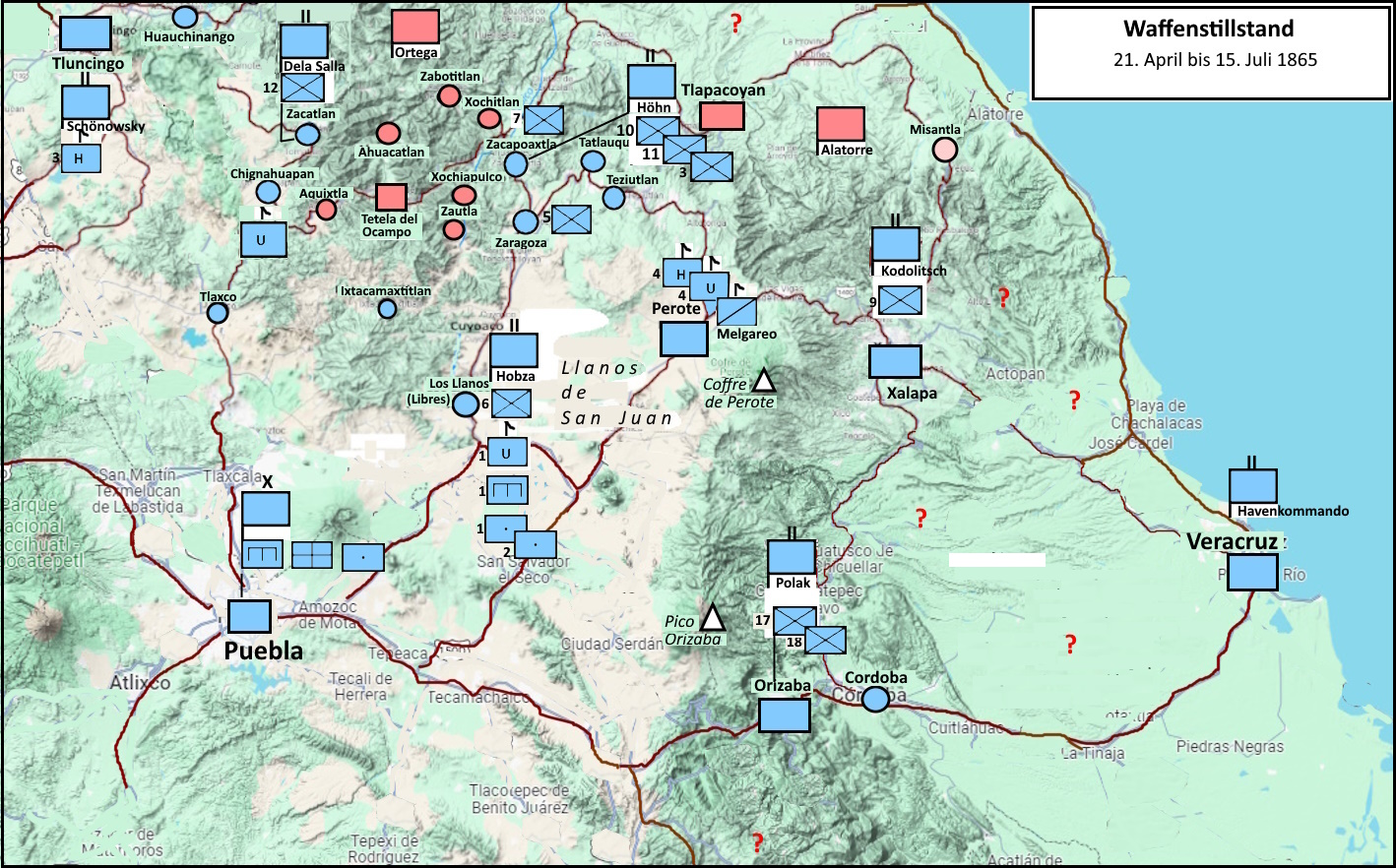Südlich von PueblaNachdem die in der Sierra de Puebla operierenden Truppen auf Erfolgskurs eingeschwenkt waren, ist es Zeit, das Augenmerk auf das südlich von Puebla liegende Operationsgebiet der Österreicher zu richten. Nachdem das Korps Ende Mai 1865 seine volle zahlenmäßige Stärke und Einsatzbereitschaft erreicht hatte, konnte im Gegensatz zum nördlichen Teil, die Besetzung des Südens, geschützt durch das Festungsdreieck Orizaba - Puebla - Oaxaca, so gut wie vom Feind ungestört erfolgen und sich auf die Garnisonen Puebla und Orizaba zunkonzentrieren, wovon Teile zur Sicherung des Knoten Punktes Palmar ausgeschieden wurden.
