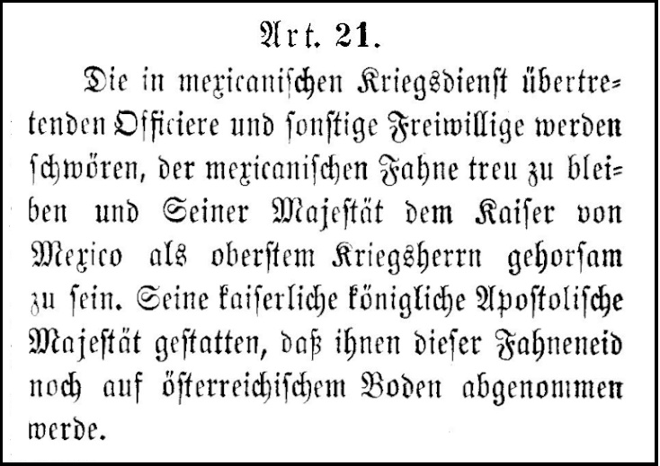 III. Das Österreichisch-belgische FreiwilligenkorpsAls Gegenleistung für den Verzicht auf die Agnatenrechte, hatte Kaiser Franz Josef die Anwerbung und Aufstellung eines Freiwilligenkorps in der Stärke von etwa 6000 Mann genehmigt. Damit folgte er dem Beispiel Maximilians Schwiegervater, König Leopold von Belgien, der schon zuvor an die 1500 Belgier anwerben ließ. Diese beiden Freiwilligenverbände sollten Maximilian nach Mexiko folgen, um ihn bei der Etablierung seiner neuen Herrschaft zu unterstützen.