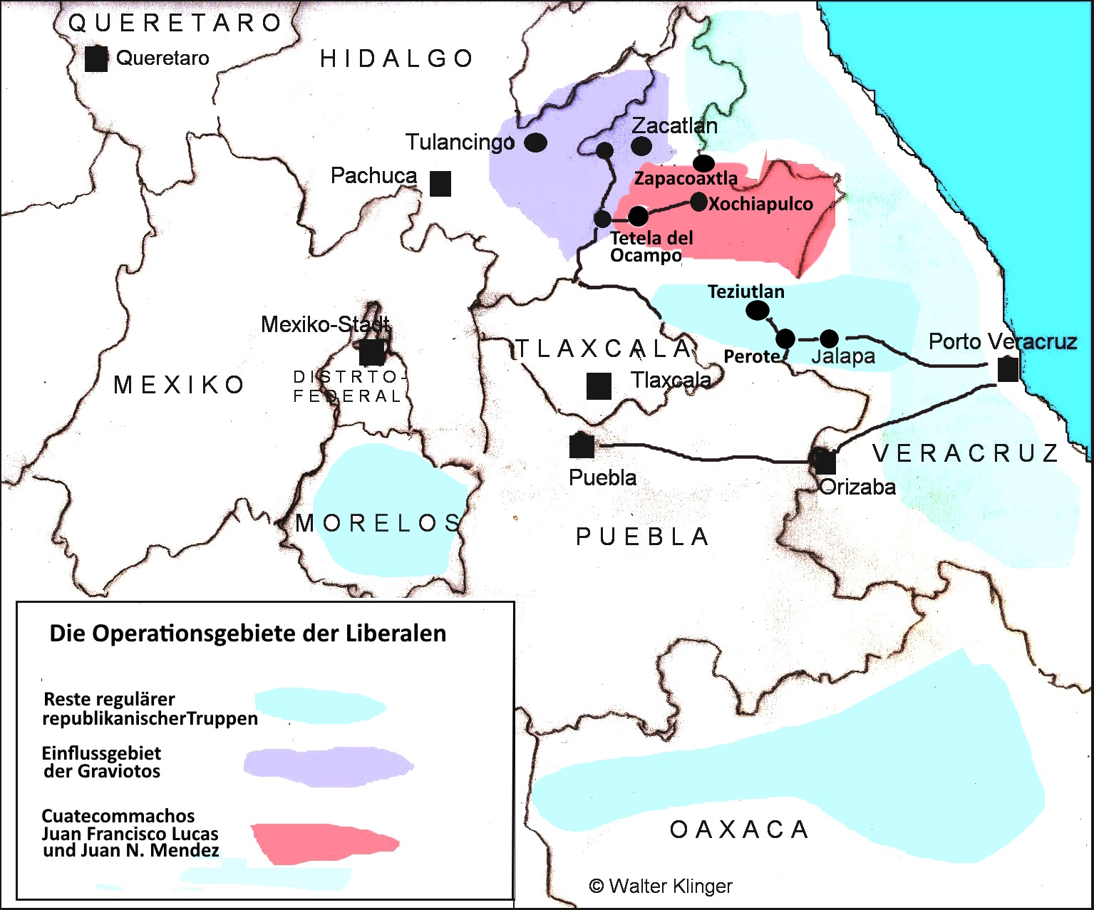 Im südlichen Teil haben sich die Reste der republikanischen Kräfte nach der Einnahme von Oaxaca in die Sierra Zongolica abgesetzt und unter Oberst Figueroa gesammelt